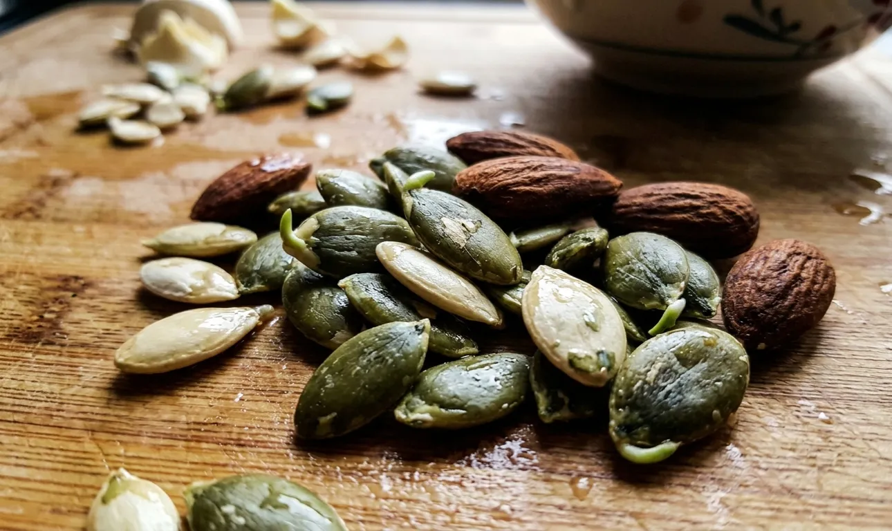 Ta en liten handfull råa pumpafrön eller råa mandlar